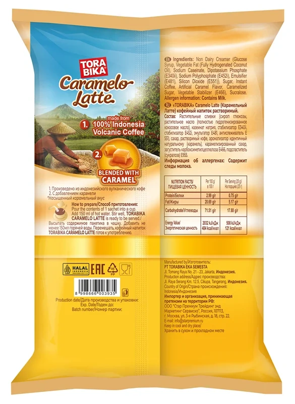 Torabika Caramelo Latte - это идеальное сочетание 100% индонезийского вулканического кофе с насыщенной карамелью. Это превосходное сочетание 100% индонезийского вулканического кофе с насыщенной карамелью. Традиционно крепкий кофе с ярким ароматом и сладковатым послевкусием. Он дарит энергию и вдохновение, помогает сосредоточиться и насладиться даже самой маленькой деталью жизни.
