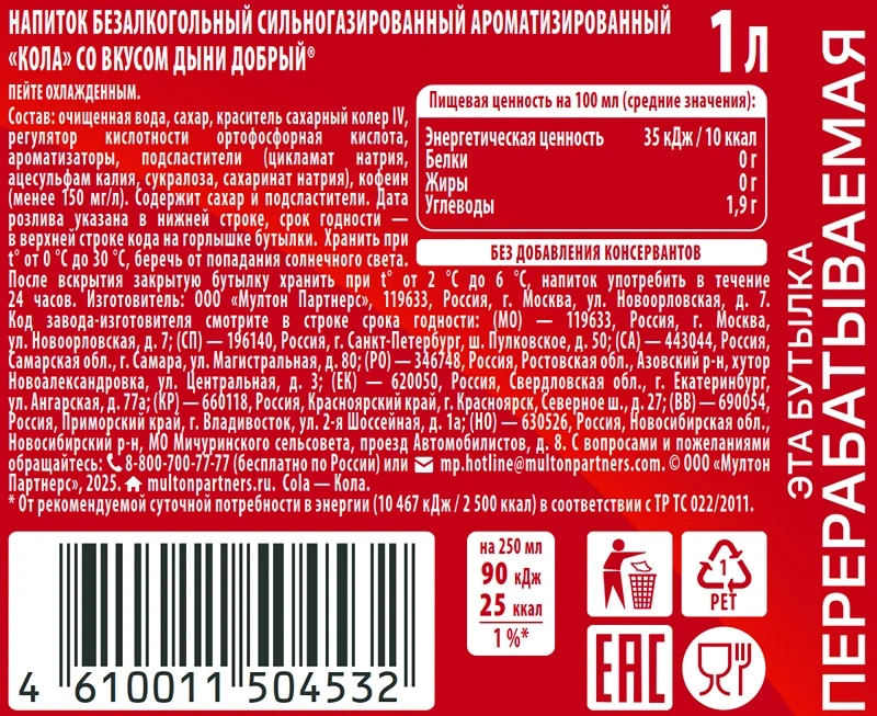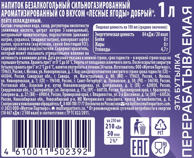 Напиток безалкогольный с соком, среднегазированный, низколорийный. Содержит сахар, Продукт со вкусом ананаса и манго на основе природной минеральной питьевой столовой газированной воды “Perrier”.