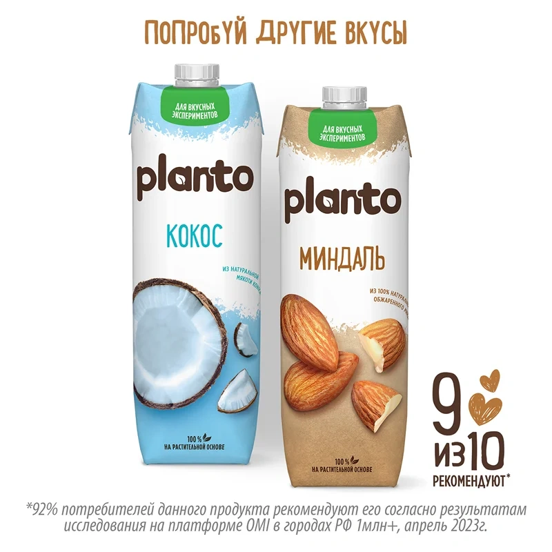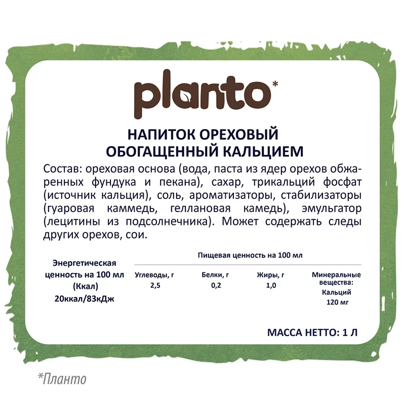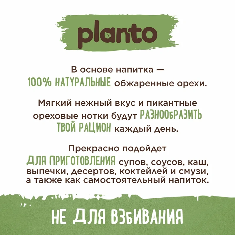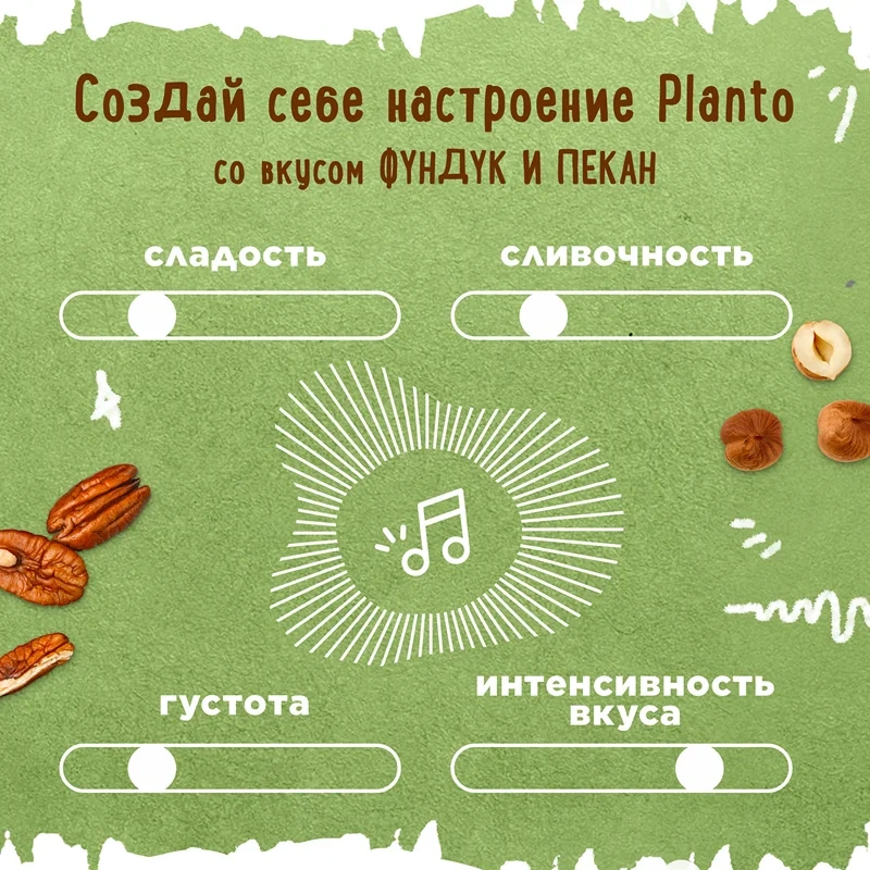Planto Фундук-пекан - это напиток на 100% растительной основе. В нем ты не найдешь красителей и консервантов, только нежный ореховый вкус, полезные ненасыщенные жиры и пищевые волокна, а также 30% дневной нормы кальция.