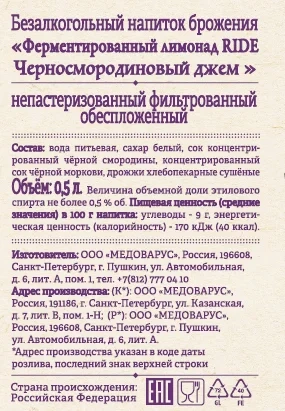 Напиток Ride ферментированный с черносмородиновым джемом газированный, 500мл