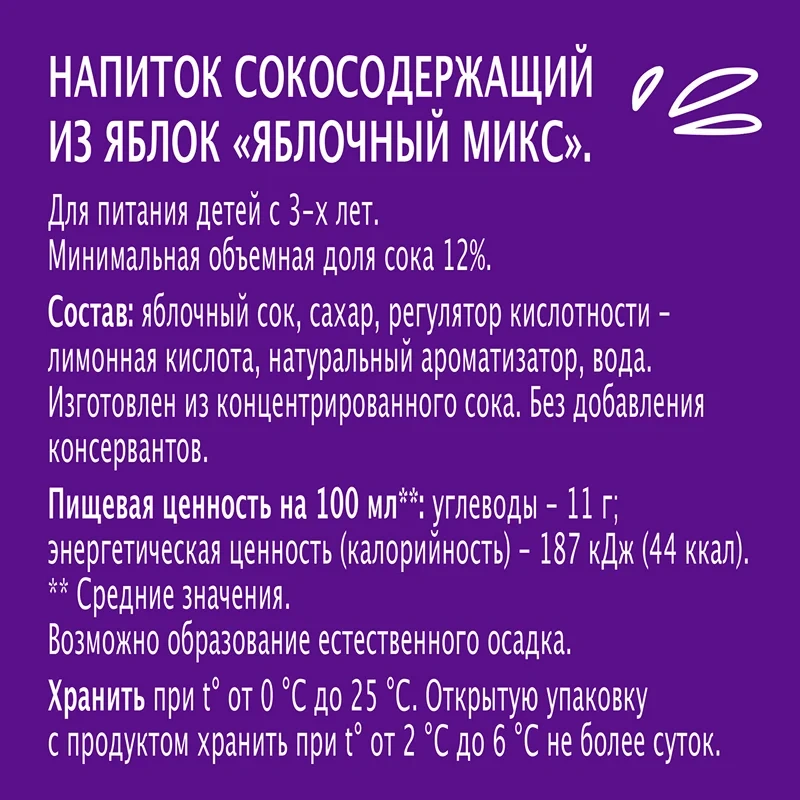 Напиток сокосодержащий Моя семья Яблочный микс, 1.93л x 6 шт - оптимальный баланс сладкого и ароматного яблока придает продукту насыщенный яркий вкус. Моя Семья Яблочный микс не содержит ГМО, произведен из настоящих фруктов без добавления консервантов. Большая упаковка объемом 1,93 литра отлично подойдет для всей семьи. Нектар с оптимальным балансом зеленых и красных яблок, что обеспечивает ему яркий и насыщенный вкус. Высокое содержание витаминов в напитке помогает укреплять иммунитет и оказывает полезное воздействие на организм в целом. Нектар произведен из натуральных ингредиентов без добавления консервантов и красителей, поэтому подходит для питания детей с 3-х лет.