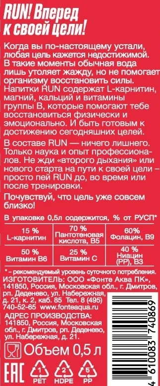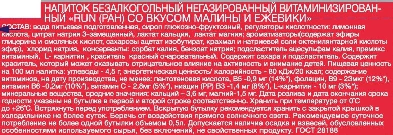 RUN! - функциональные спортивные напитки на основе солевого раствора электролитов и микроэлементов. Витамины группы В и L-carnitine в составе RUN! нормализуют работу иммунной и нервной системы и способствуют улучшению обмена веществ в организме. Не жди второго дыхания или нового старта на пути к своей цели — просто используй RUN! до, во время или после тренировки. Функциональный напиток RUN! Малина-ежевика с ярким ягодным вкусом поддержит организм полезными микроэлементами и придаст силы для новых стартов. Представьте себя на кроссфите в хвойном лесу или на пробежке в парке и ощутите новые эмоции!