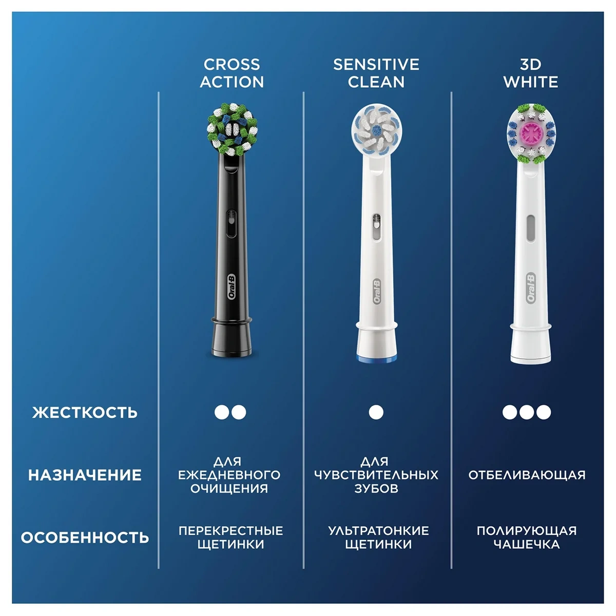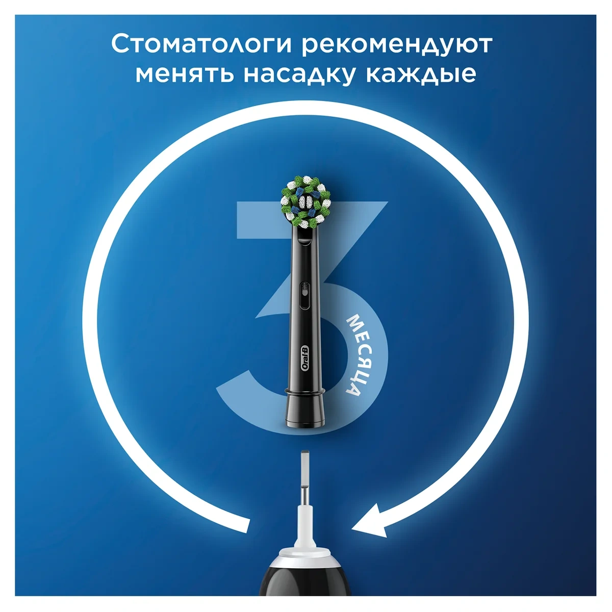 Сменные насадки Cross Action Black для электрических зубных щеток Oral-B дарят ощущение профессиональной чистки каждый день. Благодаря круглой форме и наклонному расположению щетинок, насадки повторяют контуры каждого зуба и эффективно удаляют налет со всех сторон. Насадки хорошо прочищают межзубные промежутки, а также пространство вдоль линии десен. Улучшенные насадки с технологией CleanMaximiser меняют цвет с зеленого на желтый, когда приходит время замены. Особенности насадок Oral-B Cross Action Black: разработаны при поддержке стоматологов; эффективнее справляются с бактериальным налетом, чем мануальные аналоги; совместимы со всеми электрическими щетками Oral-B, кроме серии iO и Pulsonic; подходят для ухода за чувствительными зубами и деснами. Позаботьтесь о здоровье полости рта сегодня. В комплект входят две сменные насадки. Выбирайте Oral-B — это марка зубных щеток № 1, используемая большинством стоматологов мира. **На основании международных опросов P&G, проводимых среди репрезентативной выборки стоматологов регулярно, в т. ч. в 2013-2019 гг.