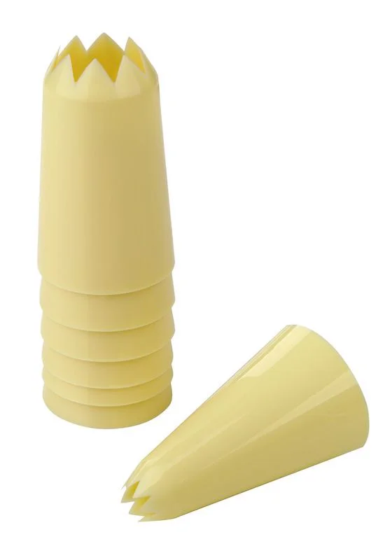 METRO PROFESSIONAL Насадка для кондитерского мешка Звезда сделает ваши кулинарные творения более изысканными и оригинальными. Благодаря этому аксессуару ваши десерты станут настоящими произведениями искусства и удивят гостей. Просто установите насадку на кондитерский мешок и начинайте творить. Это отличное решение для тех, кто хочет легко и быстро придать своим десертам интересный внешний вид. Насадка подходит для украшения самых разнообразных десертов, начиная от тортов и капкейков и заканчивая печеньем и маффинами. Она сделана из прочного пищевого пластика, безопасного для здоровья человека. Материал устойчив к высоким и низким температурам, что обеспечивает долгий срок службы изделия. Насадку можно очищать как ручным способом, так и в посудомоечной машине. Позвольте себе быть уникальными в мире сладких угощений и создавайте десерты, которые радуют глаза и гастрономически поражают ваших гостей! В наборе поставляется 7 насадок.