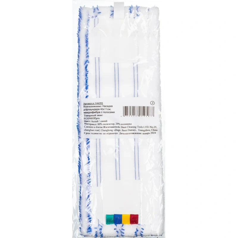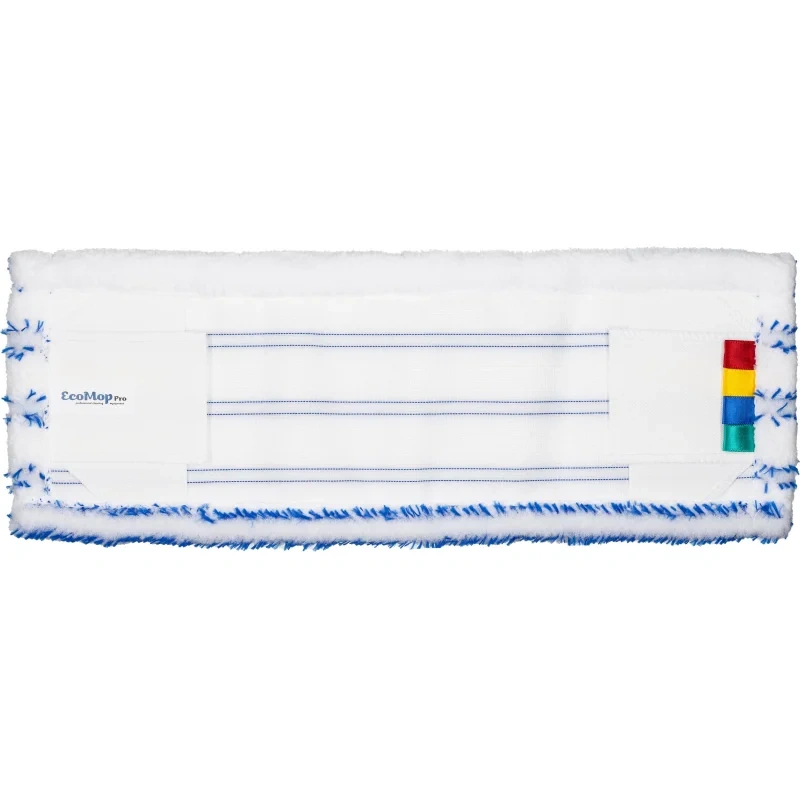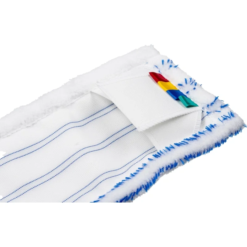 Крепление через карманы и уши обеспечивает надёжную фиксацию насадки на основании швабры и совместимость с разными видами флаундеров. Вес изделия составляет 120 г, что делает его удобным в работе. Бело-синяя расцветка дополняется цветовой маркировкой в виде вставок разных цветов, что облегчает организацию уборки по стандартам ХАССП и позволяет разграничивать зоны применения.