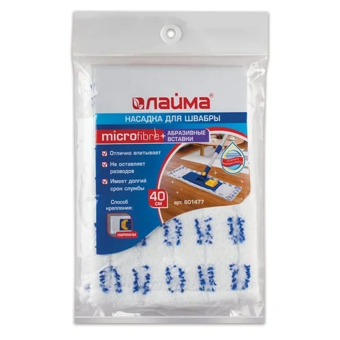Моп имеет форму плоского прямоугольника, такая форма и чистящая поверхность из ворса длиной 0.8 см позволяет удобно собрать грязь по углам и захватить большую площадь убираемой поверхности, что в свою очередь уменьшает временные затраты на уборку больших площадей. Устойчива к износу, что обеспечивает долгий срок службы уборочного инструмента. Выполнена из микрофибры и имеет размер 40х10 см. Максимальный объем впитывания - 150 мл. Используется в комплекте со шваброй, крепится к держателю с помощью карманов.