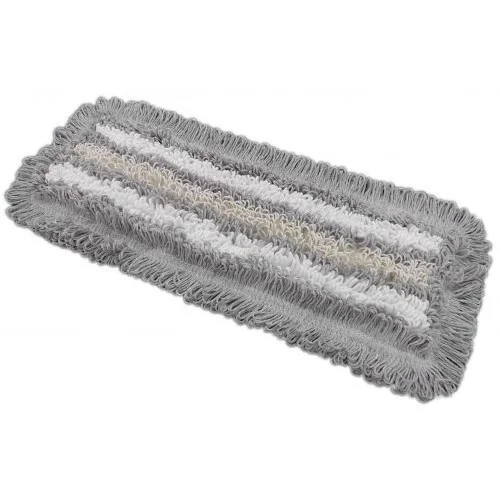 Сочетание микрофибры и смесовой (хлопок-полиэстер) серой пряжи делает моп менее марким при длительной эксплуатации. Хорошо скользит по полу, легкий в работе. Ряды петель плотно прилегают друг другу, исключая истирание рабочей поверхности. Мопы, изготовленные по этой системе, равномерно отжимаются во всех типах отжимов («роликовых», «туннельных», «прессовых» и др.), что значительно повышает скорость и качество уборки пола.Водопоглощение 270%Серый цвет мопа хорошо маскирует загрязнение мопа при длительной эксплуатации. Белые вставки из микрофибры позволяют следить за степенью загрязненности мопа. Благодаря тому что во время крашения серые волокна проходят термическую обработку, из него уже удалили основные масляные загрязнения и пропитки. Поэтому моп имеет максимальное водопоглощение среди петельных мопов уже при первой эксплуатации.