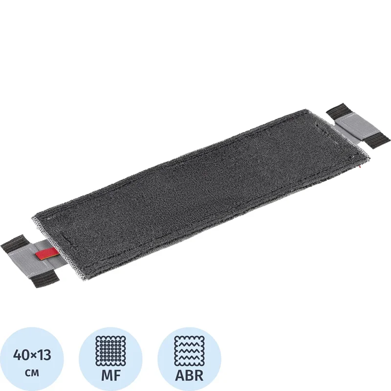Насадка для швабры-флаундера размером 40×13 см выполнена из микрофибры с абразивным слоем. Короткостриженое основание дополнено нейлоновой щетиной, которая выступает над поверхностью и обеспечивает механическое удаление загрязнений. Микрофибра создаёт водную прослойку и удерживает моющий раствор, а щетина разрушает и снимает стойкие загрязнения. Такое сочетание материалов позволяет проводить влажную уборку с элементами агрессивного воздействия.