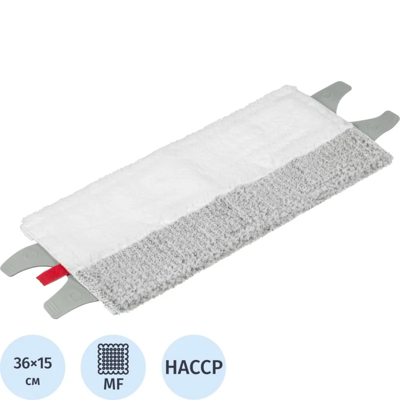 Насадка МОП Росмоп из комбинированной микрофибры предназначена для швабры-флаундера (плоской) и подходит как для влажной, так и для сухой уборки. Она объединяет два типа волокон: мягкую белую микрофибру для бережного сбора грязи и влаги и серую щёточную микрофибру с грубой структурой, которая разрушает стойкие загрязнения и эффективно работает в швах и неровностях пола.