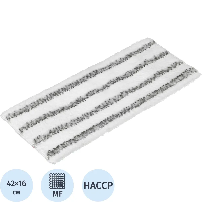 Размер — 42×16 см, вес — 80 г. Цвет — белый/серый. Крепление универсальное: карманы, уши или комбинация «карманы + уши». Насадка совместима с системой цветовой кодировки ХАССП. Средний срок службы — 2–3 месяца.