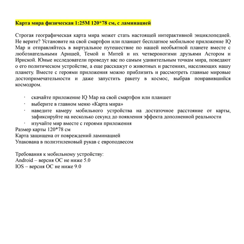 Интерактивная физическая карта Мира Globen - серьезное учебное пособие, которое можно легко превратить в интересную обучающую игру. Достаточно просто скачать бесплатное приложение IQ Map на смартфон или планшет, чтобы простая карта превратилась в 'живую'. Навести камеру смартфона на карту, подождать несколько секунд до появления эффекта AR-технологий. Такая карта, использующая AR-технологии, поможет ребенку намного быстрее и лучше усвоить новую информацию, научит ориентироваться на карте, привьет интерес к новым знаниям. Выполнена карта с точным соблюдением масштаба, принятых условных географических обозначений. Таблица условных обозначений вынесена в отдельный список. Классическая цветовая гамма изображения общегеографической карты. Кроме географических объектов на карте отмечены столицы, крупные города, порты, границы стран.