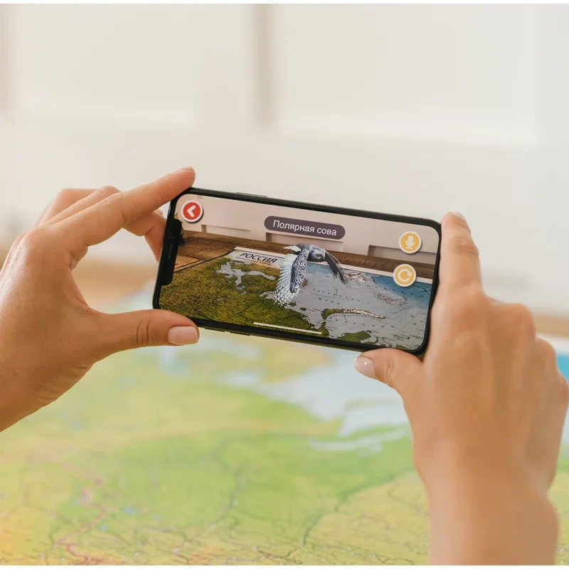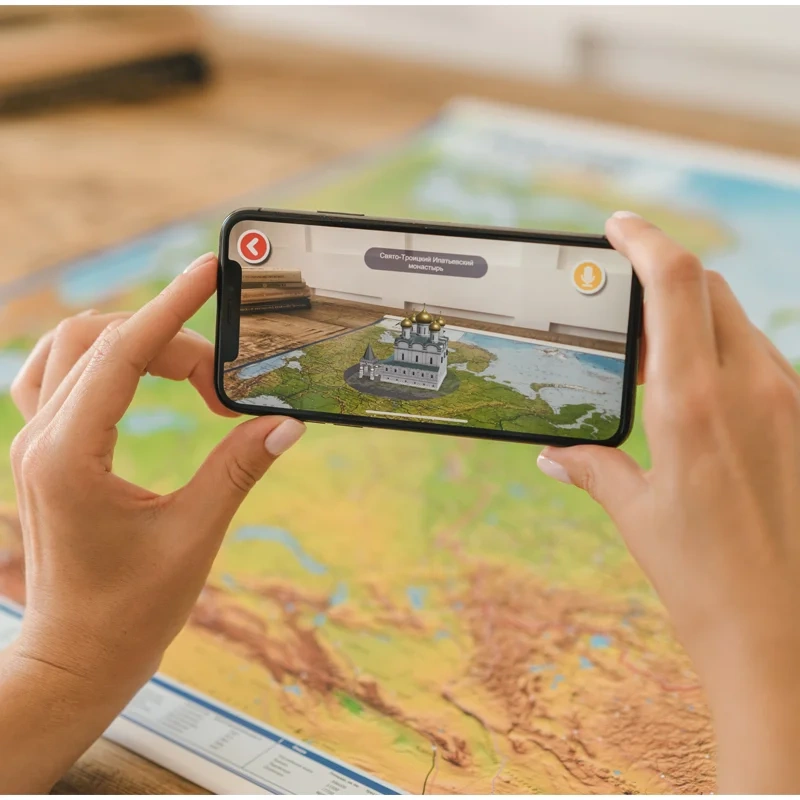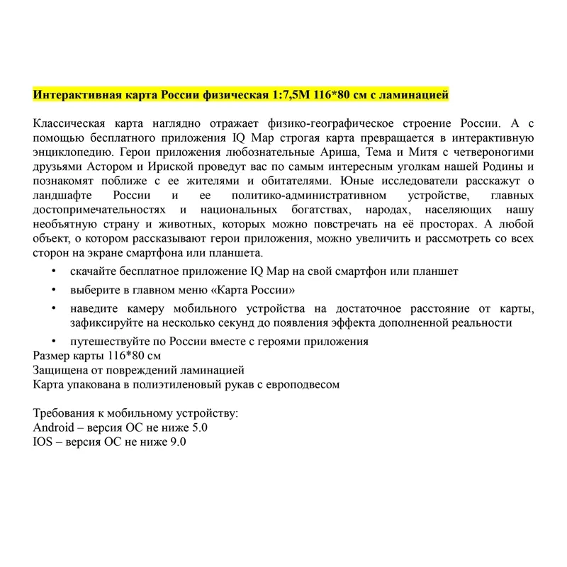 Интерактивная физическая карта Российской Федерации Globen - новое современное учебное пособие с элементами дополненной реальности для изучения географии и окружающего мира. Достаточно просто скачать бесплатное приложение IQ Map на смартфон или планшет, чтобы простая карта превратилась в 'живую'. Навести камеру смартфона на карту, подождать несколько секунд до появления эффекта AR-технологий. Такая карта, использующая AR-технологии, поможет ребенку намного быстрее и лучше усвоить новую информацию, научит ориентироваться на карте, привьет интерес к новым знаниям. Без использования приложения карта Мира является серьезным учебным пособием. Выполнена с точным соблюдением масштаба, принятых условных картографических обозначений. Таблица условных обозначений вынесена в отдельный список. Классическая цветовая гамма изображения общегеографической карты. Кроме географических объектов на карте отмечены города, границы областей и республик, сеть дорог. В нижней части карты расшифровка числовых обозначений и дополнительная информация.