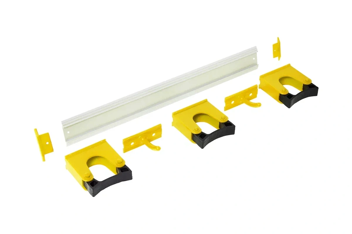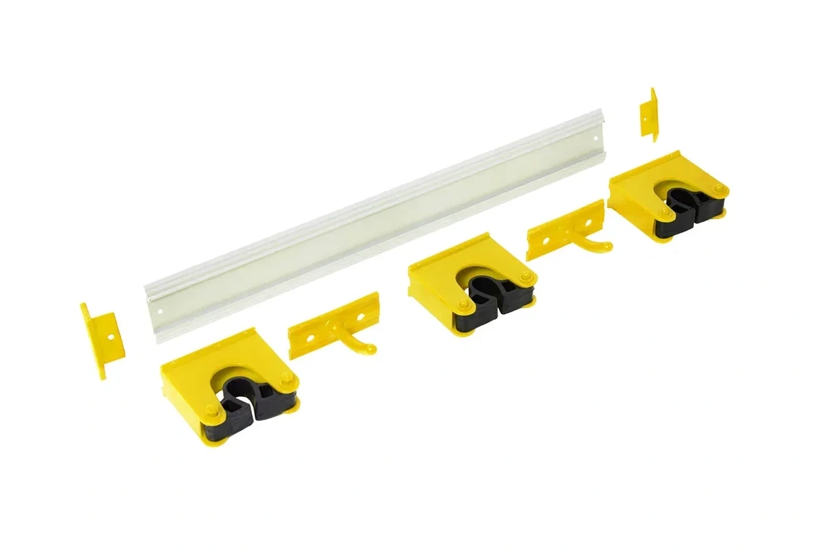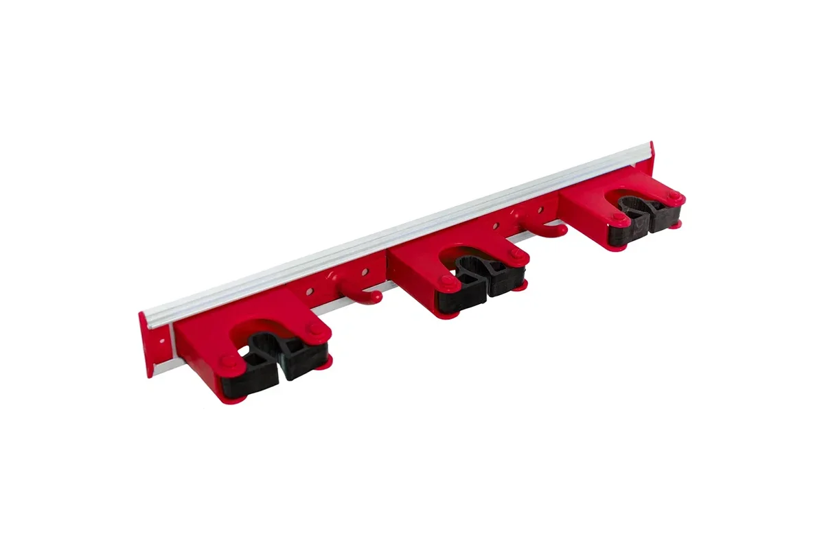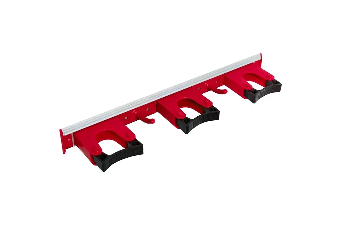 Настенный органайзер для уборочного инвентаря. Состоит из трех универсальных держателей рукояток и двух крючков для подвешивания салфеток, щеток или другого ручного инвентаря. Длина 40 см.