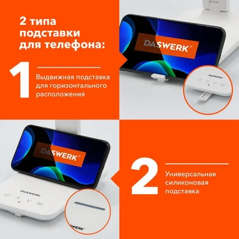 Светильник обладает двумя типами подставки для телефона: выдвижная подставкой для телефона позволит разместить телефон горизонтально; силиконовая полоска на корпусе светильника надежно зафиксирует телефон как горизонтально, так и вертикально.