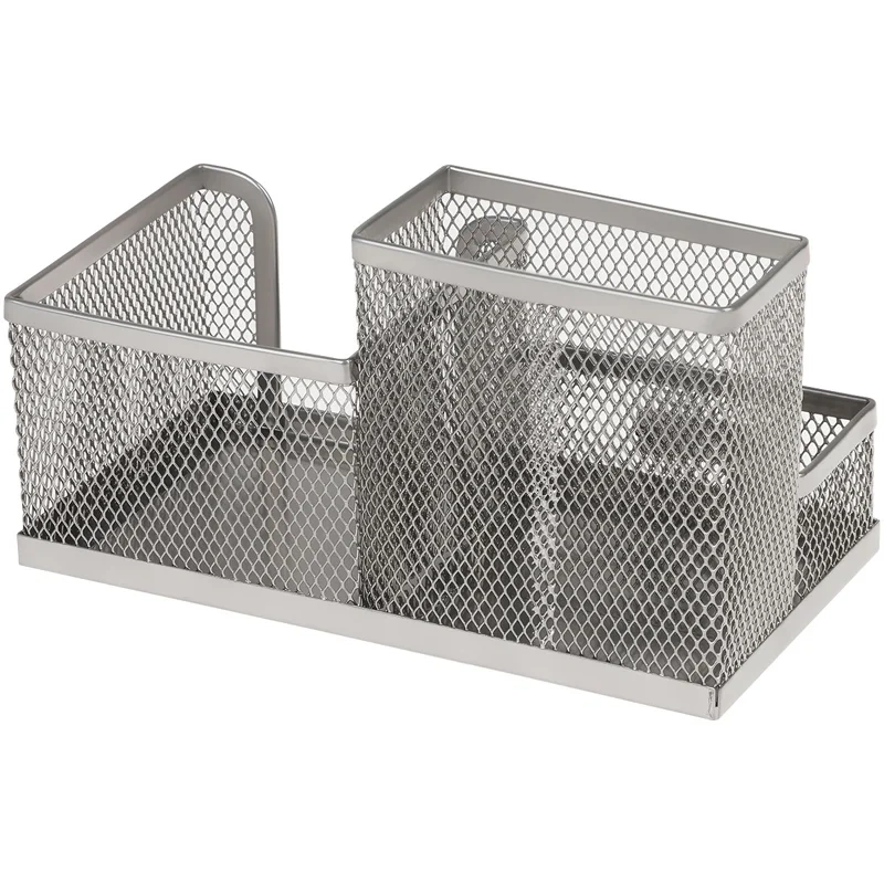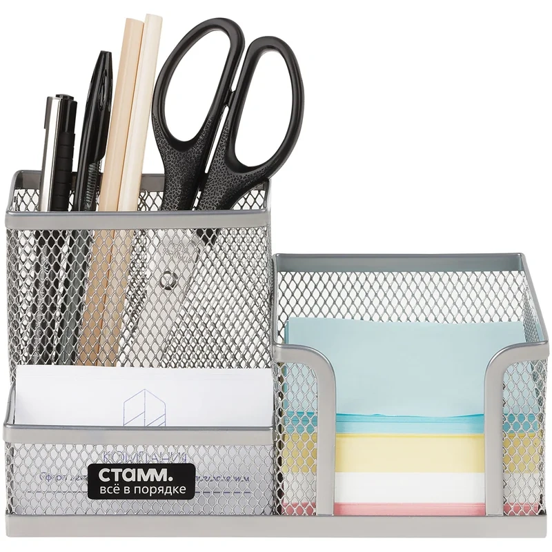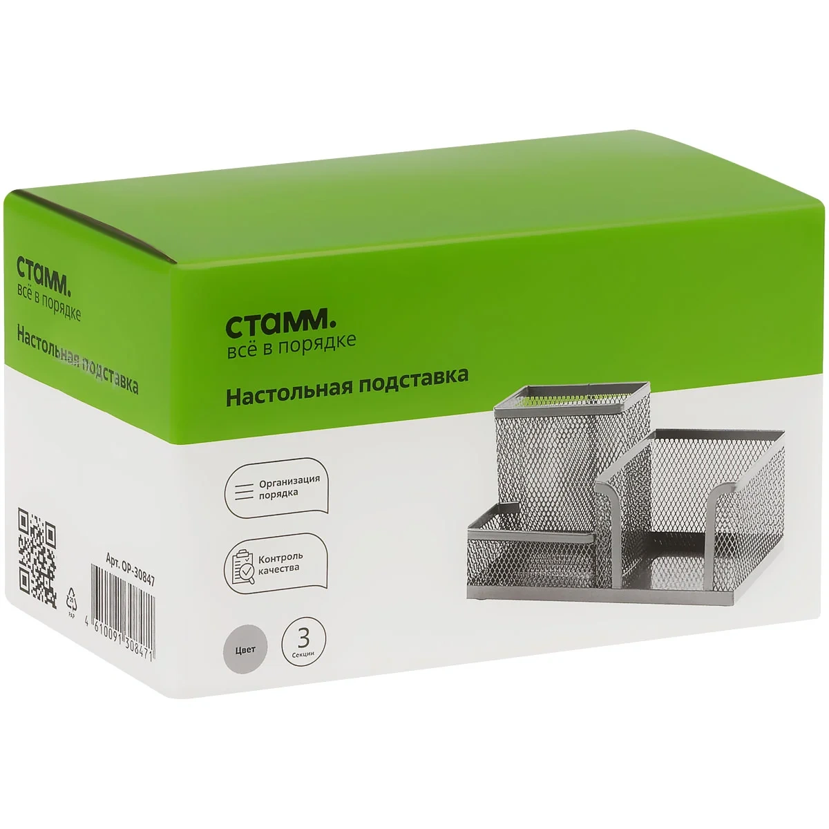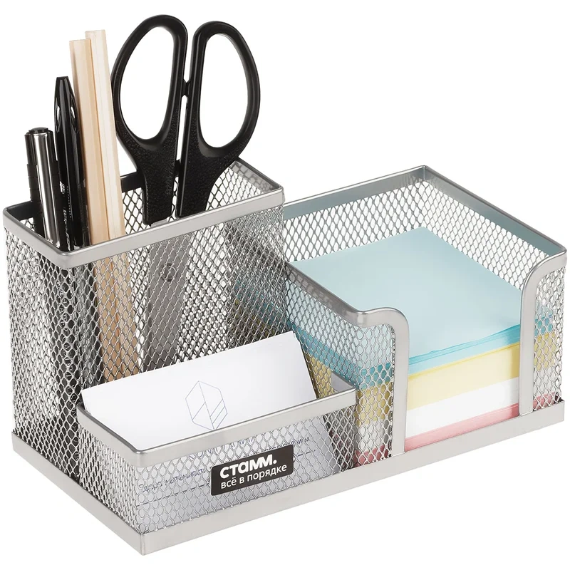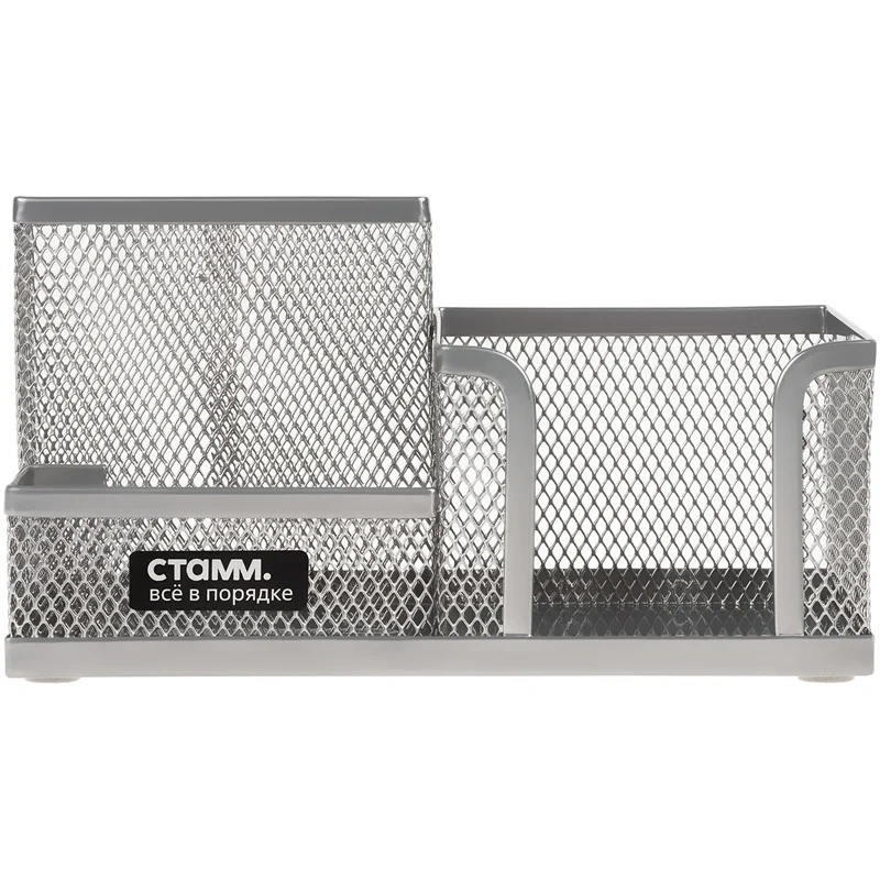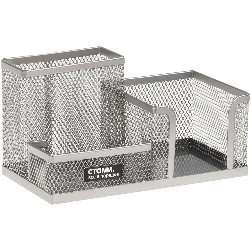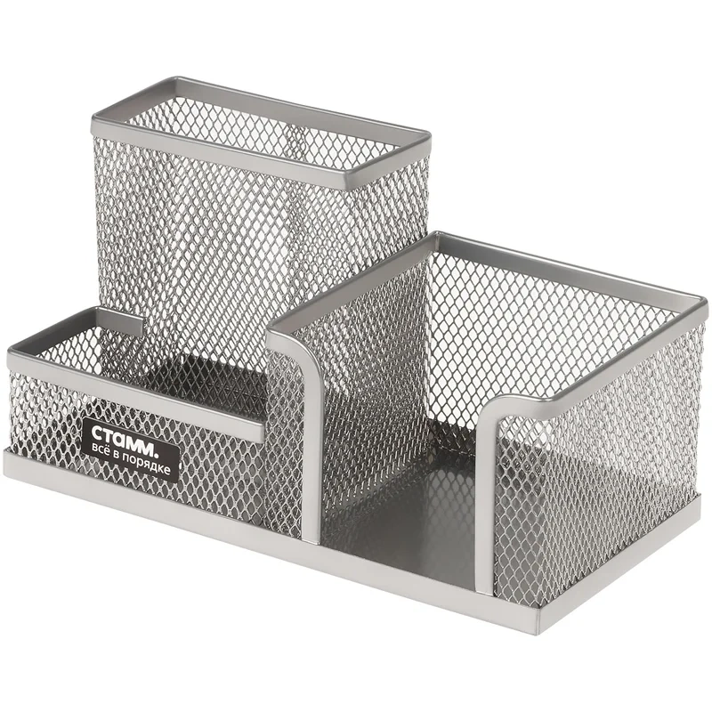 Настольная подставка СТАММ с 3 отделениями обладает функциональной и стильной конструкцией, которая подходит для хранения канцелярских мелочей. Прочный серебристый корпус выполнен из высококачественного металла, а сетчатое исполнение предотвращает образование пыли внутри. Имеются мягкие подушечки на дне, предотвращающие скольжение и повреждения поверхности.