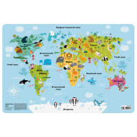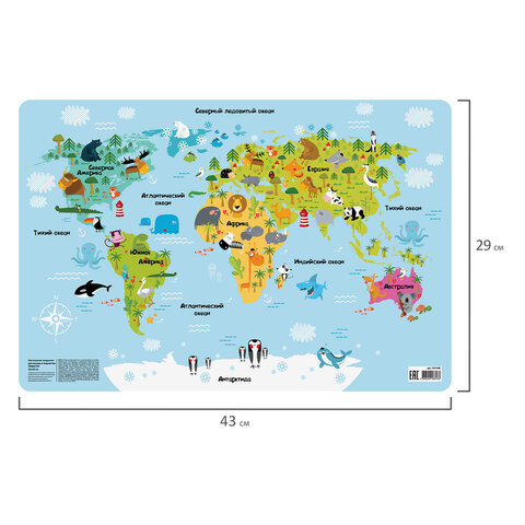 Настольное покрытие для письма и творчества ПИФАГОР предназначено для защиты рабочей поверхности во время творческих занятий как в школе, так и дома. Карта мира с изображением забавных зверушек заинтересует ребенка и позволит получить первые знания о месте обитания животных. Предусмотрена для многоразового использования.
