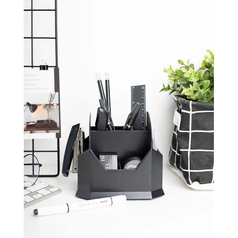 Отличное решение для рабочего стола. Подставка занимает минимум места и вмещает в себя все нужны канцелярские мелочи для работы.