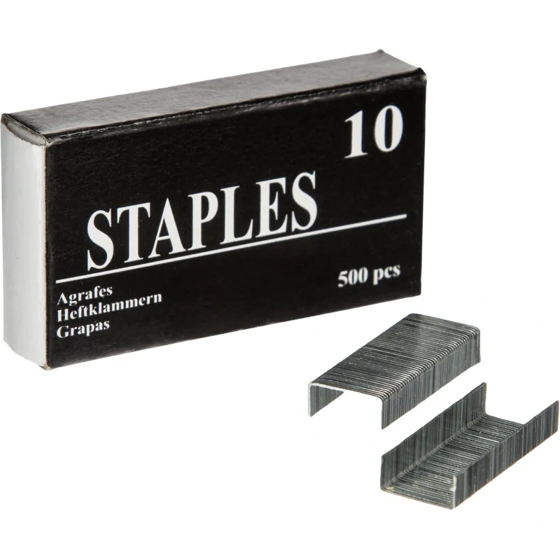 подставка, два карандаша с ластиком, две шариковые ручки, канцелярский нож, точилка, ластик, ножницы (длина - 13 см), блок для записи, линейка, клейкая канцелярская лента (длина - 7 метров, ширина - 12 мм), силовые кнопки, степлер 10, скобы для степлера 10, антистеплер, скрепки.