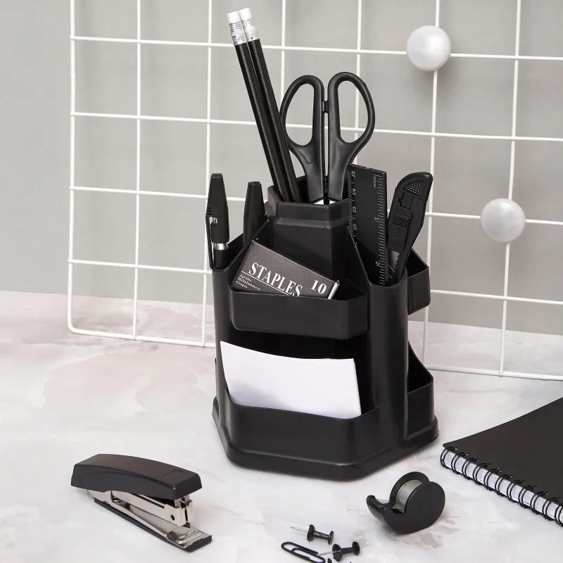 Отличное решение для рабочего стола. Подставка занимает минимум места и вмещает в себя все нужные канцелярские мелочи для работы. Имеет вращающуюся на 360 градусов основу.