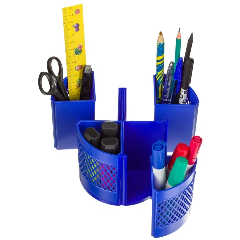 Подставка для канцелярских мелочей Attache хорошо подойдет для рабочего стола и не займет много места. Все необходимые канцелярские принадлежности всегда будут под рукой. Компактная и эргономичная подставка-трансформер Attache Квартет без наполнения. В зависимости расположения лотков, количество отделений составляет от четырех до восьми. Вращается на 360 градусов. Изготовлена из ударопрочного пластика. Цвет: синий. Размеры: 110×125×125 мм.