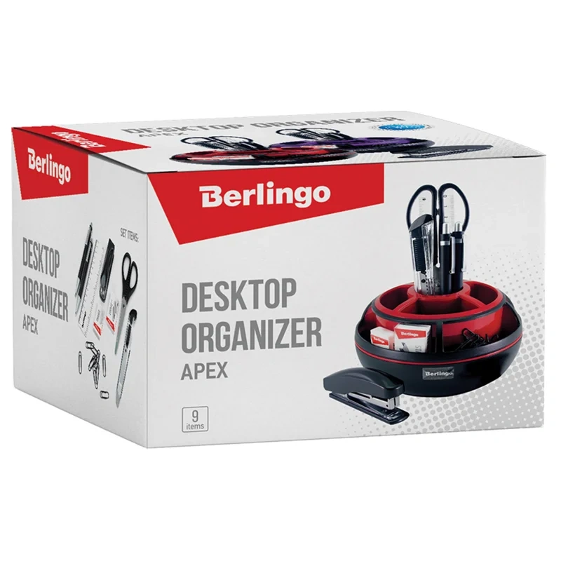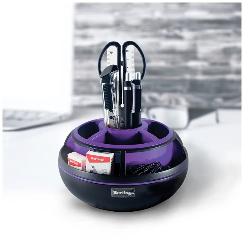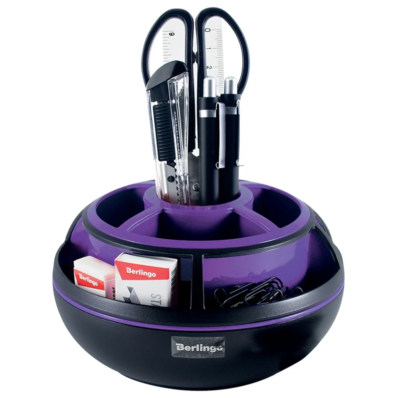 Стильный и удобный настольный органайзер Berlingo Apex с 10 секциями сочетает в себе качественное наполнение и интересный дизайн. Сочетание фиолетового и чёрного цвета делают Berlingo Apex яркой деталью рабочего стола. Качественный первичный пластик, 10 отделений и возможность вращения на 360 градусов позволяют удобно пользоваться органайзером из любого положения. В состав настольного органайзера входят: механический карандаш, автоматическая шариковая ручка, степлер, ножницы, канцелярский нож, линейка, скрепки, ластик, скобы для степлера.