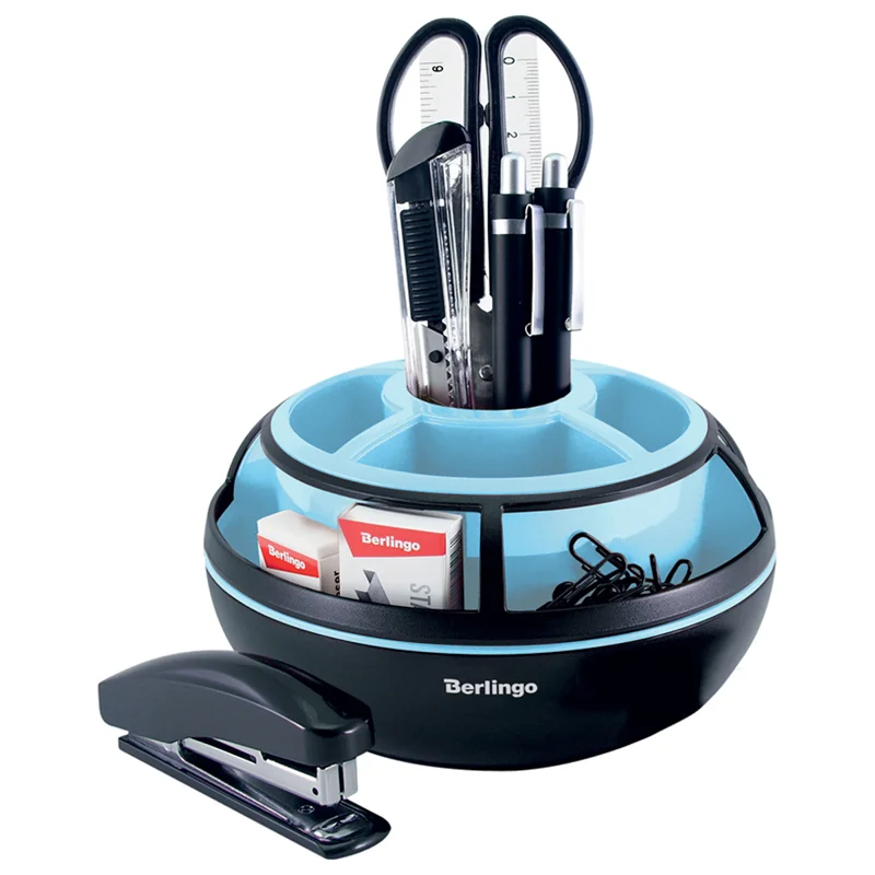 Стильный канцелярский набор Berlingo 'Instinct' с наполнением, с сочетанием двух цветов. Нежный голубой пастельный цвет аквамарин и контрастный черный. Высококачественный первичный пластик, блестящая поверхность, возможность вращения на 360 градусов. Качественное наполнение. В состав входят: механический карандаш, автоматическая шариковая ручка, степлер, ножницы, канцелярский нож, линейка, скрепки, ластик, скобы для степлера.