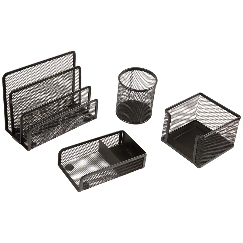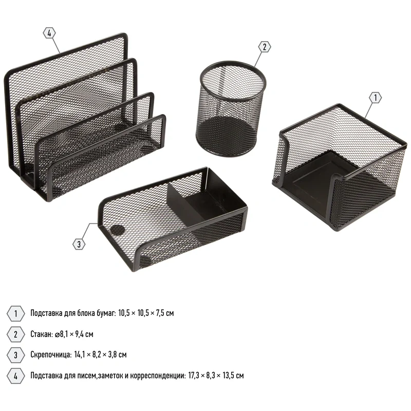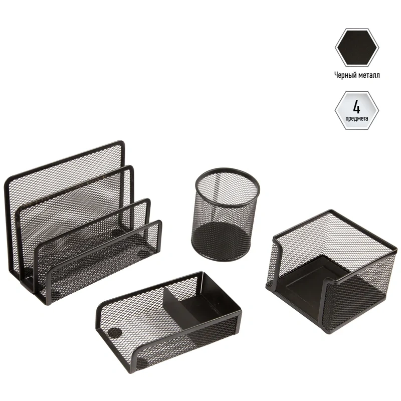 Стильный и функциональный набор из 4 предметов. Предметы изготовлены из металлической сетки. Упаковка в лакированную коробку. У всех подставок в наборе имеются мягкие подушечки на дне, предотвращающие скольжение и повреждения поверхности. Черный цвет. Прочный корпус из высококачественного металла. Сетчатое исполнение предотвращает образование пыли внутри. В комплект набора входят 4 предмета: подставка-органайзер для пишуших принадлежностей,