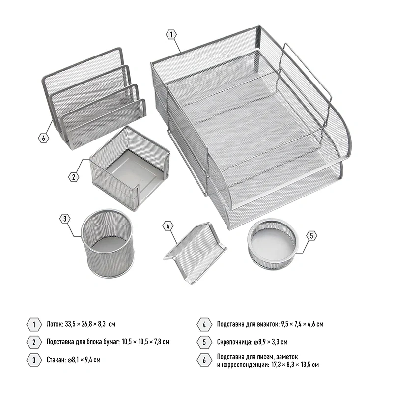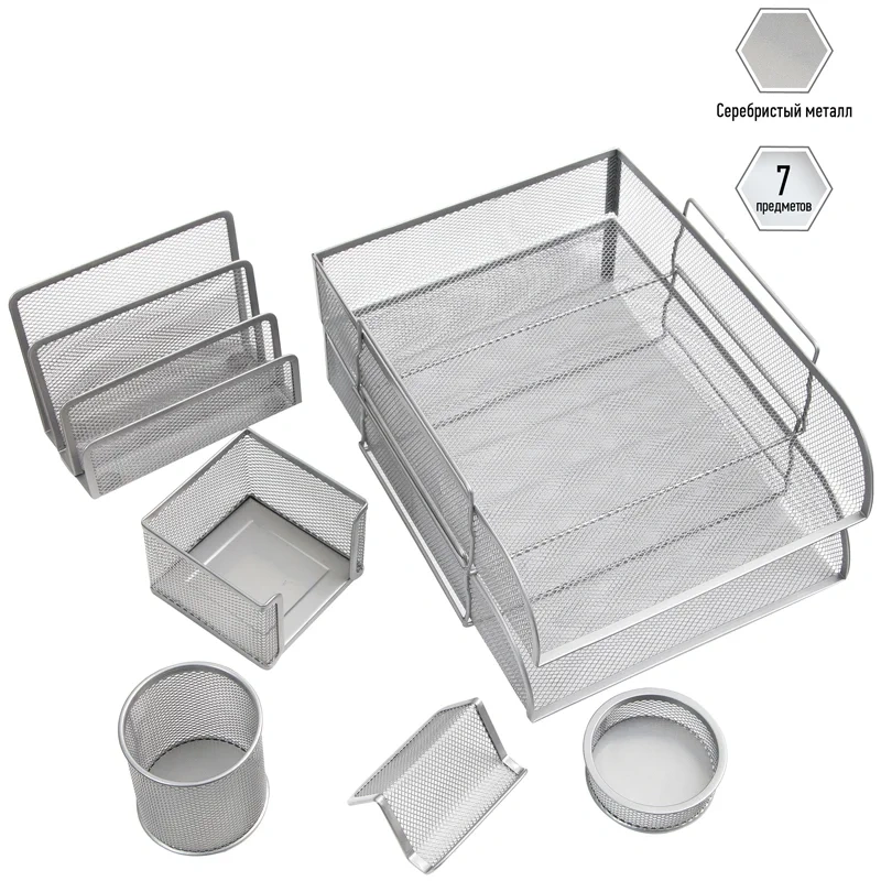 | Состав набора | лоток 2шт, подст. для писем, подст. для бум.блока, стакан, подст. для визиток, подст. для мелочей |