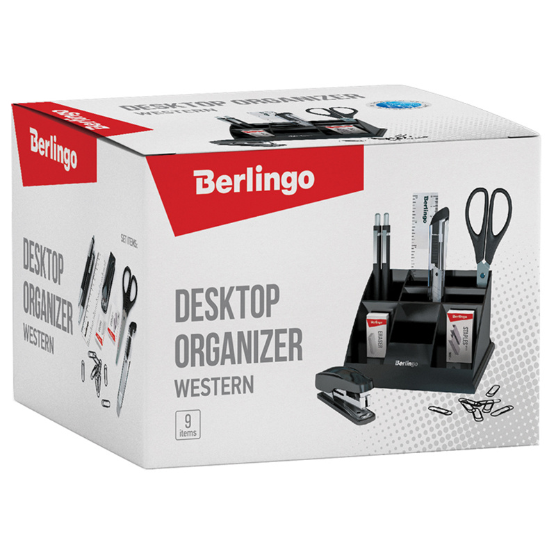 Лаконичный дизайн корпуса. Материал - пластик. Качественное наполнение из 9 предметов для ежедневной работы в офисе.