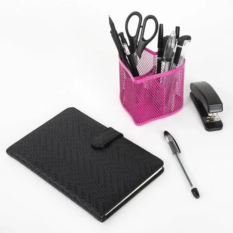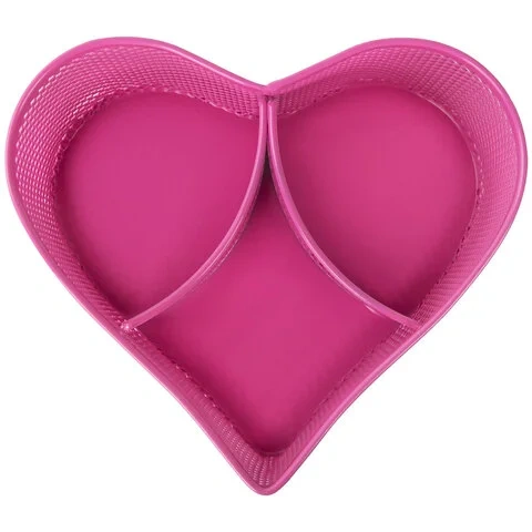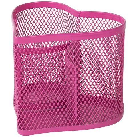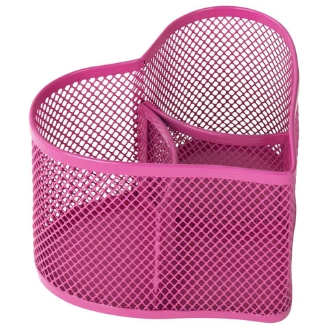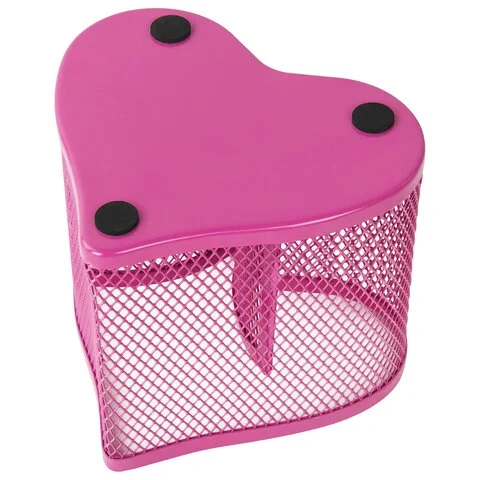 Изготовлена из металлической сетки розового цвета в форме сердца. Имеет размеры 105х118х95 мм. Состоит из трех отделений. Мягкие подушечки на дне предотвращают скольжение и порчу мебели. Поставляется без канцелярского наполнения.
