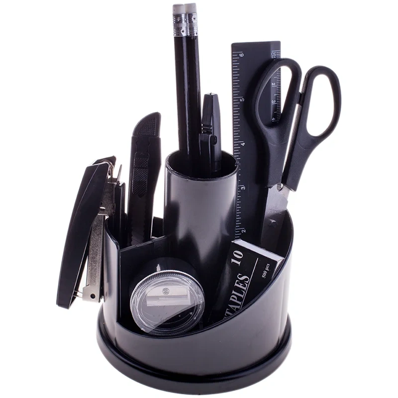 Стильный и удобный настольный органайзер OfficeSpace «Русские горки» с 6 секциями сочетает в себе качественное наполнение и интересный дизайн. Качественный чёрный пластик и возможность вращения на 360 градусов позволяют удобно пользоваться органайзером из любого положения. В состав настольного органайзера входят 12 предметов: 2 карандаша, шариковая ручка, степлер, точилка, кнопки, ножницы, канцелярский нож, линейка, скрепки, ластик, скобы для степлера.