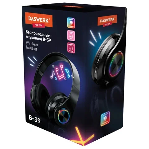Наушники беспроводные большие светящиеся накладные, чёрные DASWERK B-39, 513805