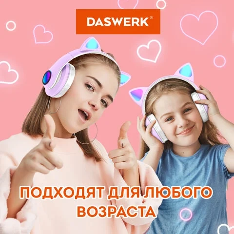Беспроводные наушники с ушками DASWERK изготовлены из прочного и легкого abs-пластика. Подойдут как для девочки, так и для мальчика.