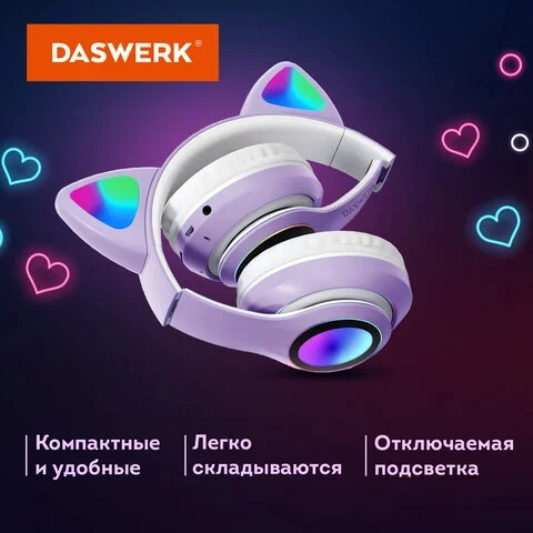 Наушники беспроводные игровые накладные, с ушками, светящиеся, фиолетовые DASWERK STN-28, 513801