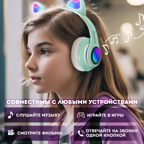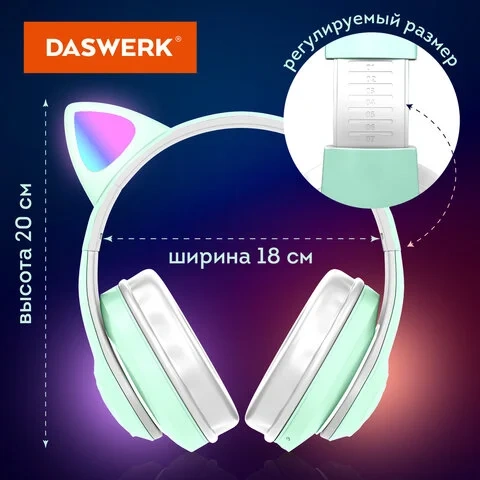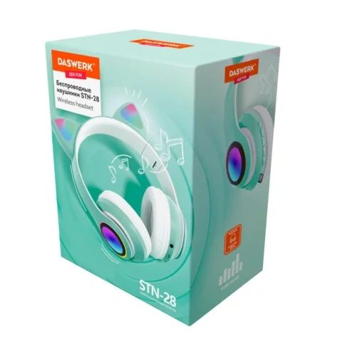Наушники беспроводные игровые накладные, с ушками, светящиеся, мятные DASWERK STN-28, 513804