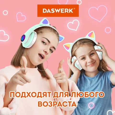 Беспроводные наушники с ушками DASWERK изготовлены из прочного и легкого abs-пластика. Подойдут как для девочки, так и для мальчика.