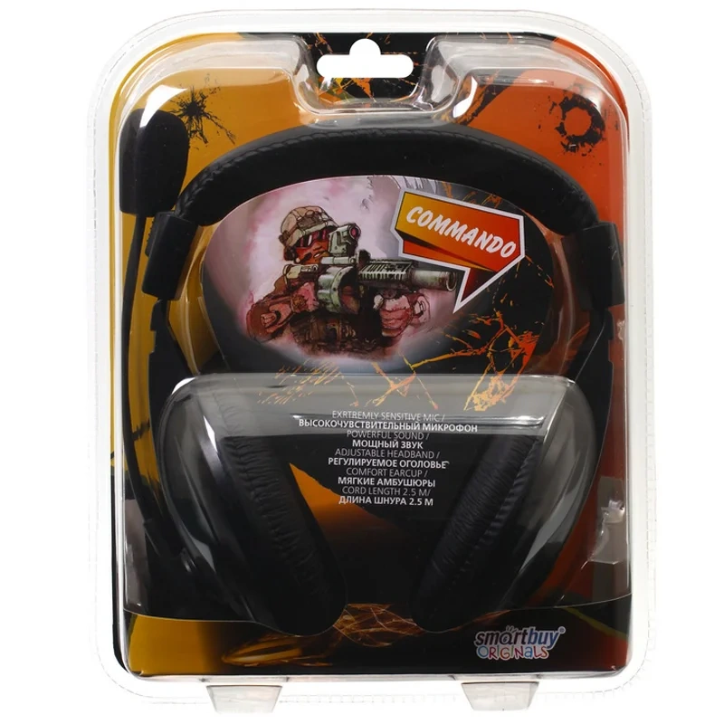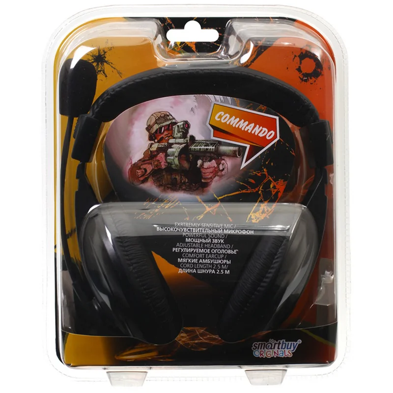 Наушники с микрофоном Smartbuy Commando, с регулятором громкости, 2,5м, черный