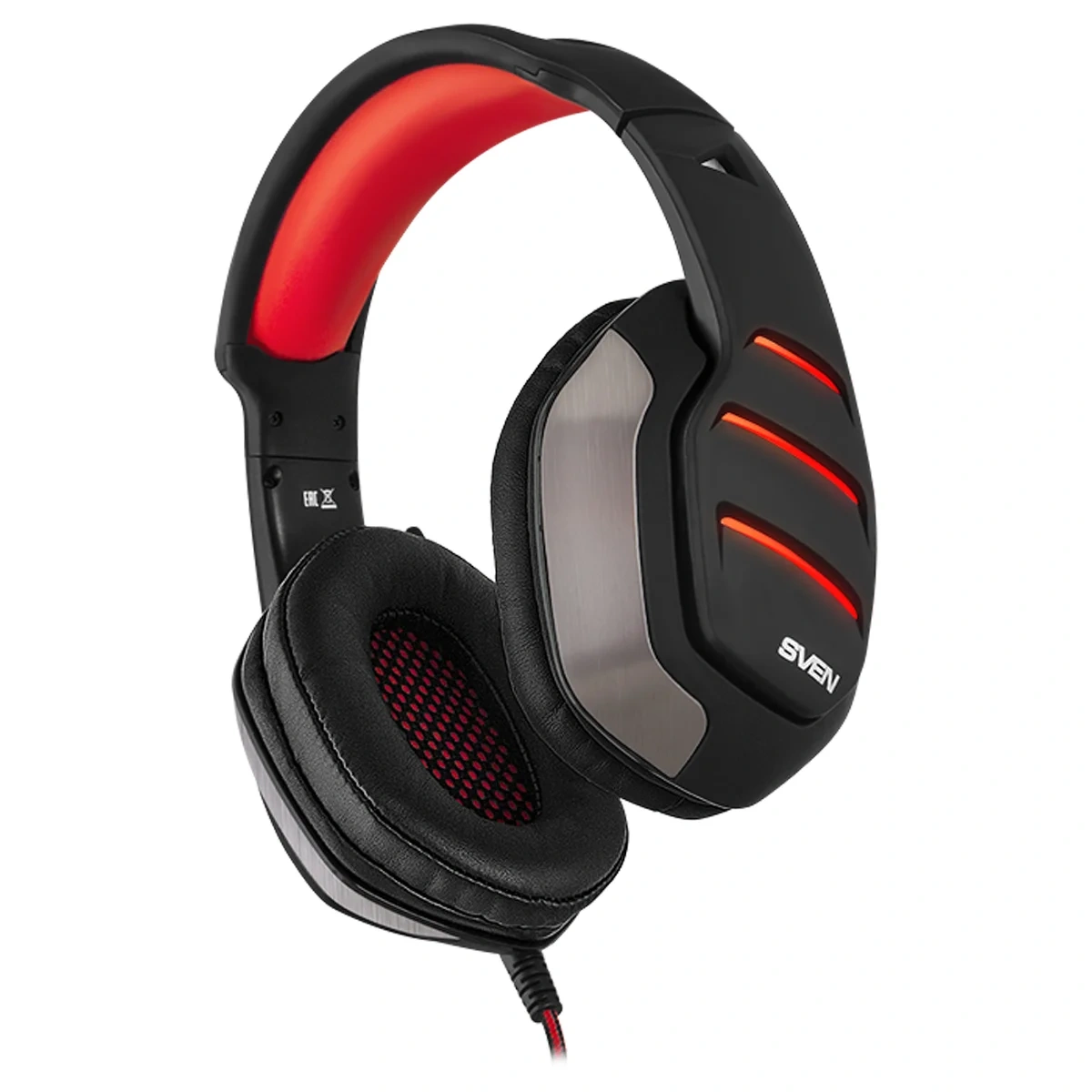 Счастливый обладатель этой модели получит эргономичную гарнитуру, выполненную из качественного пластика с покрытием Soft touch, с мягким оголовьем и удобными амбушюрами. Сочетание черного и красного, металлические вставки на чашках и оголовье придают гарнитуре воинственный и брутальный вид. При желании можно включить подсветку чашек и микрофона. Сделать это очень легко с помощью удобного пульта, расположенного на кабеле в тканевой оплетке. На пульте также находятся кнопки включения и выключения микрофона, регулировки громкости.