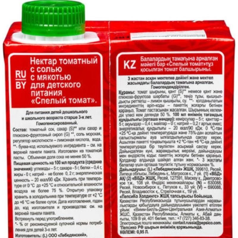 Напиток ЛЮБИМЫЙ, спелый томат, 0,95 л обладает насыщенным пикантным вкусом и густой текстурой, в которой сок и мякоть помидоров органично дополняет морская соль. Продукт не содержит искусственных красителей и консервантов, поэтому его можно включать в меню детей школьного возраста и малышей старше 3 лет. Напиток, изготовленный на основе натуральных овощей, хорошо освежает и утоляет жажду, приносит большую пользу организму. В нем содержатся клетчатка, пектин, бета-каротин, витамины из группы В, РР, К, С, а также калий, йод и другие необходимые для здоровья микро- и макроэлементы. Регулярное употребление напитка улучшает обмен веществ, помогает вывести токсины, положительно сказывается на работе органов желудочно-кишечного тракта, повышает иммунитет и замедляет процессы старения. За счет невысокой калорийности он подойдет даже тем, кто придерживается диеты.Напиток помещен в многослойную упаковку тетрапак, помогающую сберечь все полезные свойства свежих томатов. Практичная винтовая крышка гарантирует удобное хранение и в случае переноски продукта.Состав: томатный сок, сахар и глюкозно-фруктозный сироп, соль морская, регулятор кислотности – кислота лимонная, вода. Вкус: томат.Тип напитка: овощной сокосодержащий.Объем: 0,95 л.Изготовлен из томатной пасты. Объемная доля сока не менее 50%. Продукт предназначен для питания детей дошкольного и школьного возраста старше 3-х лет. Гомогенизированный. Встряхнуть перед употреблением.Пищевая ценность: белки 0,4 г, углеводы 5 г, сахар 5 г, натрий не более 0,2 г.Энергетическая ценность: 20 ккал.Условия хранения: хранить при температуре от 0°C до +25°C и относительной влажности воздуха не более 75%. Открытую упаковку хранить в холодильнике при температуре от +2°C до +6°C не более суток.Упаковка: Тетрапак.Срок годности: 12 месяцев.Бренд: Любимый.Страна-производитель: Россия.ТУ 10.86.10-070-05269043-2013