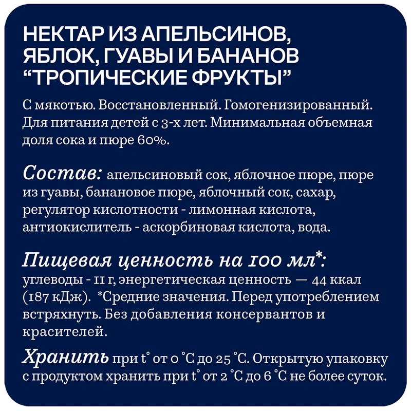 Густой нектар белого цвета с бархатистым, насыщенным вкусом и мякотью тропических фруктов. Содержит пюре и соки гуавы, банана, апельсина и яблока (общая доля 60%).