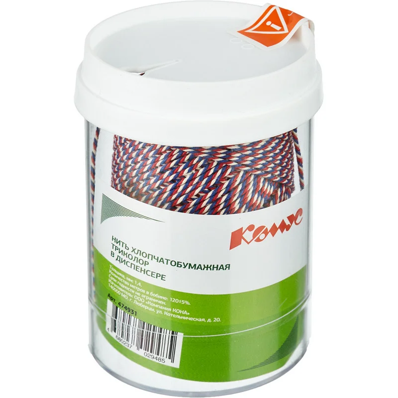 Прошивная хлопчатобумажная нить (ХБ 50 текс х 15 триколор) в диспенсере, предназначена для использования в офисах, архивах для надежной фиксации документов, аккуратного опечатывания и прошивания большого количества листов. Длина намотки — 120 м.
