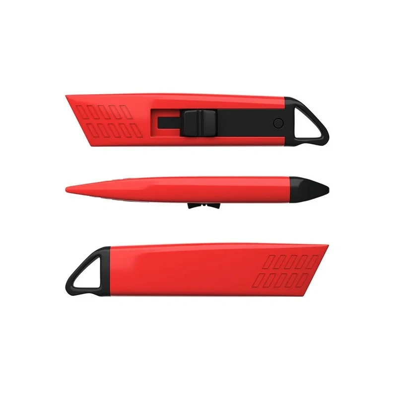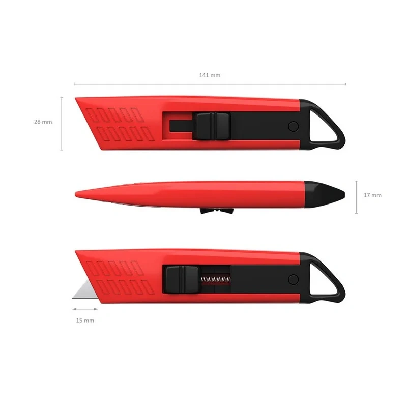 Нож канцелярский. С отверстием для шнурка. Система - возвращающееся лезвие. Размеры: 45*208*17.5мм.