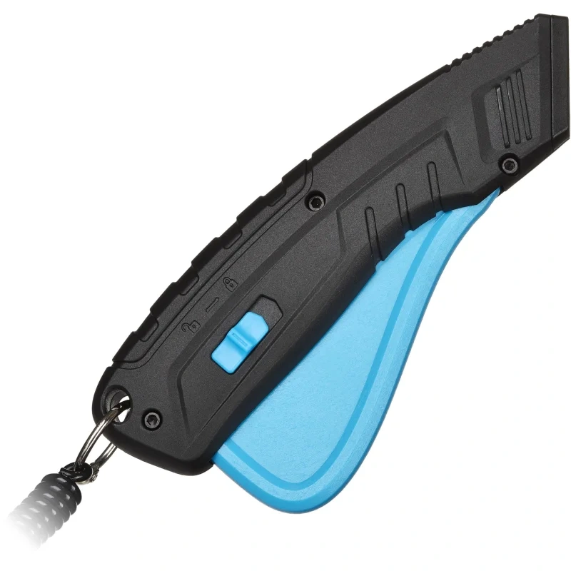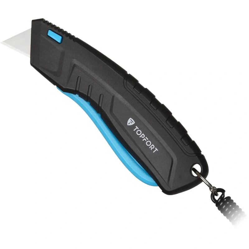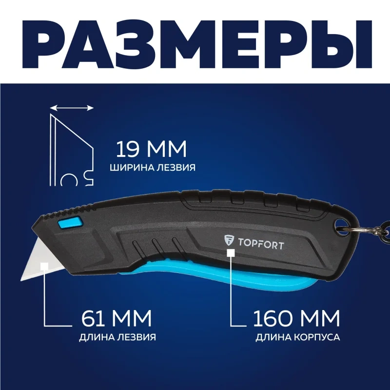 Нож безопасный TOPFORT с трапециевидным лезвием шириной 19 мм в переносном держателе (кобуре) со спиральным кабелем. Эргономичный, надежный корпус из ABS-пластика. Безопасность ножа достигается за счет возвратной пружины, которая при отпускании клавиши возвращает лезвие в корпус. Применяется для разрезания картона, обоев, ковровых покрытий, тентов, полиграфической пленки и пленки из ПВХ, для вскрытия стрейч-пленки, коробок, разрезания шпагатов и стреппинг-ленты. Рекомендуем приобрести дополнительные лезвия — арт. 1960451 (10 штук в упаковке).