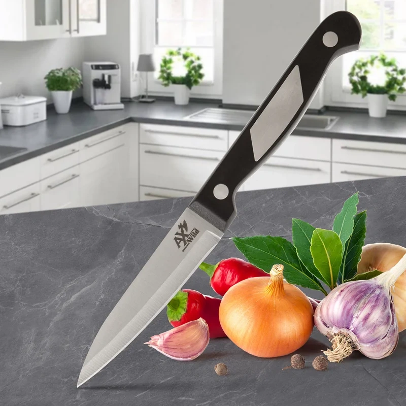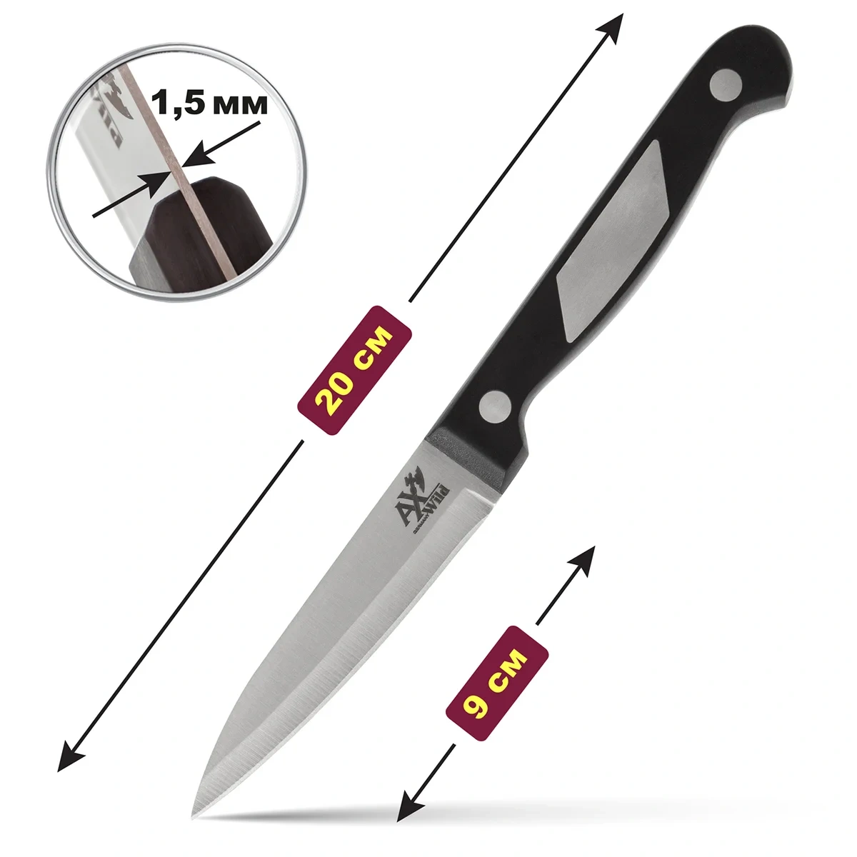Нож для чистки овощей Axwild Ideal, 9 см удобен в применении. Он остро заточен. Лезвие тонкое и прочное, с режущей кромкой. У него эргономичная ручка, которая хорошо ложится в руку. Ладонь не устает даже если приходится нарезать большое количество продуктов. Нож изготовлен из прочной стали. Изделие рассчитано на длительное использование. Лезвие не подвержено влиянию внешних факторов. Оно не выделяет вредных веществ при контакте с продуктами, не впитывает запахов и не меняет их вкусовые качества. Нож можно использовать для нарезки и чистки овощей. После работы его моют под проточной холодной или горячей водой. Помещать его в посудомоечную машину не рекомендуется. Разрешается использовать различные моющие средства.