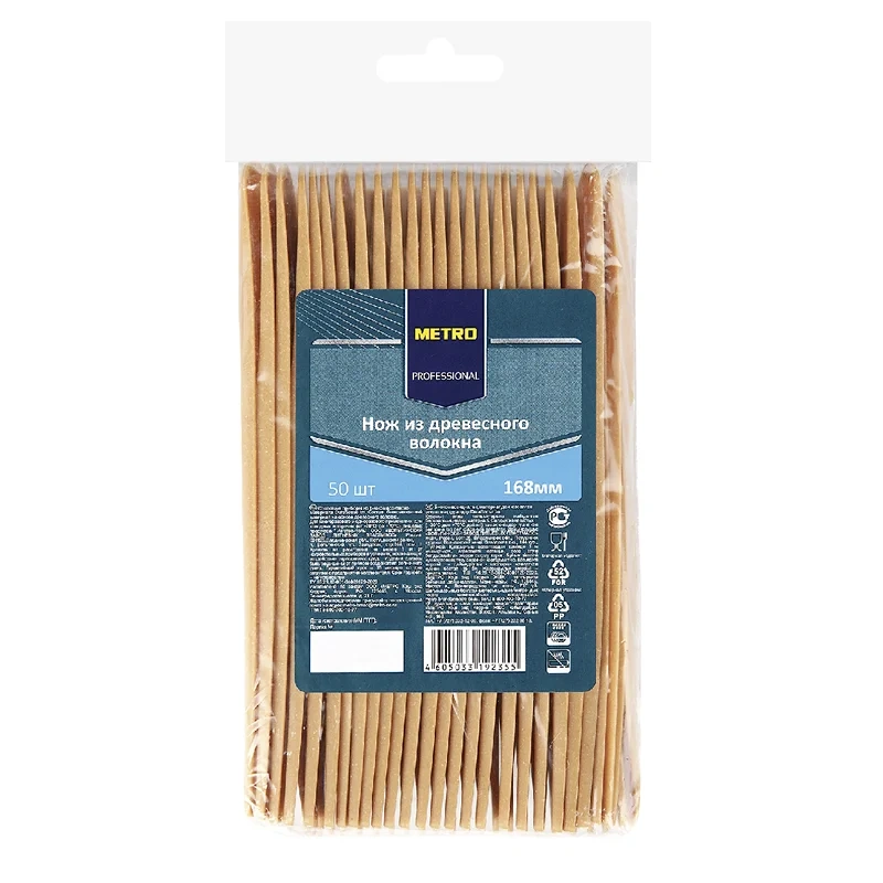 METRO PROFESSIONAL Нож из древесного волокна 168 мм, 50 шт. – экологически чистая продукция, предназначенная для использования на предприятиях общепита или в быту. Одноразовые ножи изготовлены из обработанного специальным способом древесного волокна, не покрыты вредным для здоровья человека напылением, абсолютно биоразлагаемы, не наносят вреда здоровью человека и природу. Этой посуде отдают предпочтение предприятия, придерживающиеся принципов бережного отношения к природе. Многие компании персонализируют ножи, нанося логотипы, рисунки и узоры на поверхность изделий.