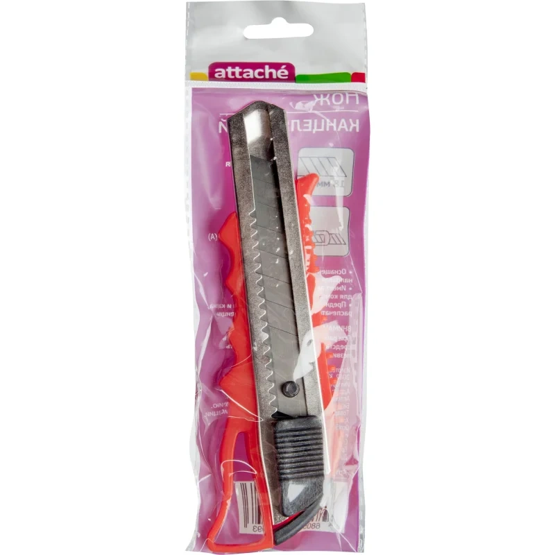 Нож канцелярский Attache с сегментированным отламывающимся лезвием. Данная модель ножа оптимальна для резки бумаги, распечатывания корреспонденции и посылок. Нож оснащён эргономичной ребристой рукояткой для увеличения противоскользящих свойств. Металлическая направляющая из нержавеющей стали обеспечивает надёжную фиксацию лезвия в момент использования. На рукоятке предусмотрено отверстие для подвешивания ножа при хранении.