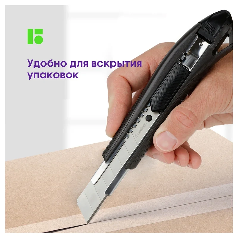 Серия 'Razzor 200'. Нож канцелярский с системой автоматической фиксации лезвия auto-lock. Корпус ножа выполнен из высококачественного ABS пластика. Имеет металлические направляющие. Комплектуется износостойким лезвием из стали SK5. Ширина лезвия - 18 мм. Индивидуальная упаковка - блистер с европодвесом. На оборотной стороне блистера есть перфорация для более удобного извлечения инструмента из упаковки.