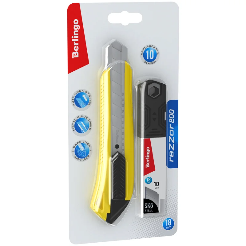 Нож канцелярский 18мм Berlingo 'Razzor 200', желтый + лезвия сменные 10шт., блистер, европодвес