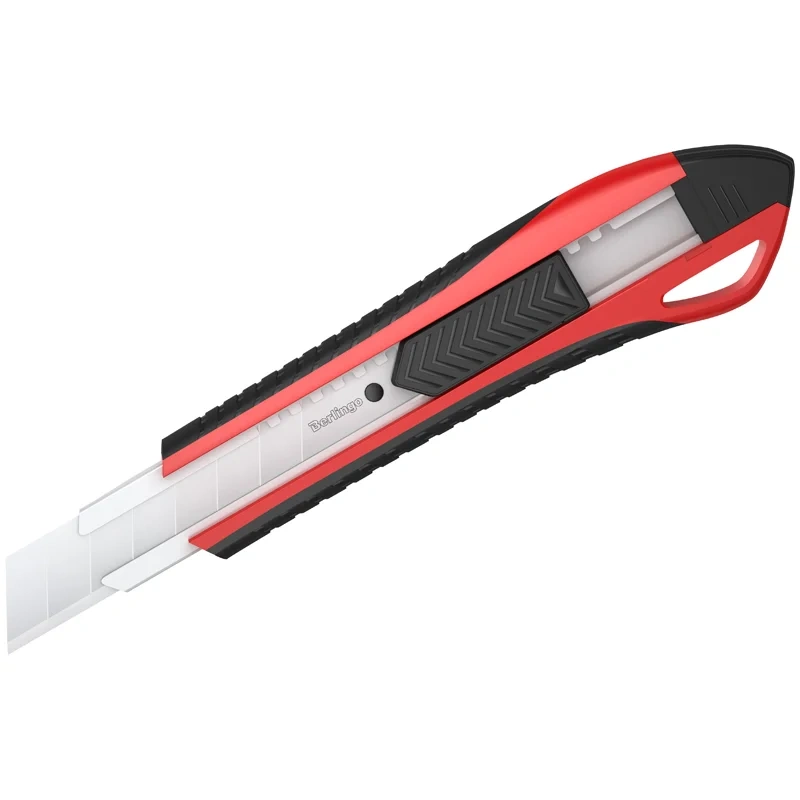Канцелярский нож Berlingo серии Razzor 300 с автоматической системой фиксации лезвия auto-lock. Ширина лезвия: 18 мм. В комплекте 10 запасных лезвий из стали SK5 с углом 30°. Корпус ножа красного цвета выполнен из высококачественного ABS пластика с применением технологии двойного литья (прорезиненные вставки). Имеет металлические направляющие. Индивидуальная упаковка – блистер с европодвесом. На оборотной стороне блистера есть перфорация для более удобного извлечения инструмента из упаковки.