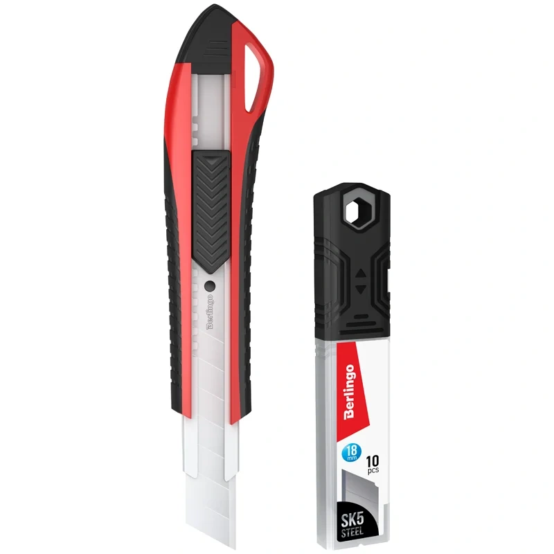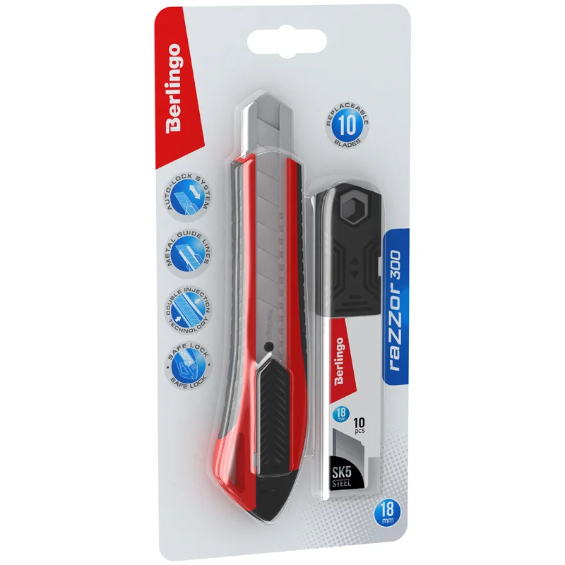Нож канцелярский 18мм Berlingo 'Razzor 300', красный + лезвия сменные 10шт., блистер, европодвес